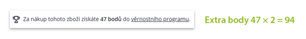 Zákazník tak může na detailu produktu vidět základní počet bodů, přičemž skutečný počet připsaných bodů odpovídá dvojnásobku této hodnoty v rámci akce „Extra body“.